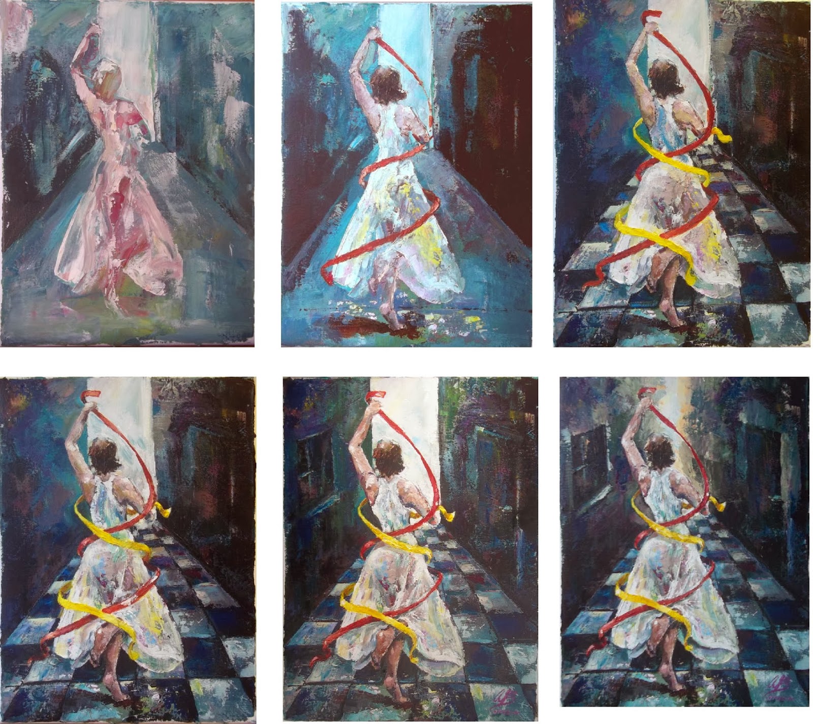 It was painted for a theme ("control"), but I'm not sure that it fits that theme as well as it might. So, while she may well be in control of her body, the ribbons and, perhaps, her destiny, that destiny is to dance freely - into the light. And I've done a different painting for the theme.